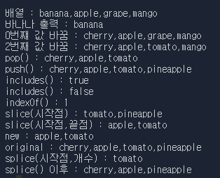 console.log("slice(시작점) : " + fruit.slice(2)) // 잘린 값이 반환됨 ["tomato","pineapple"]