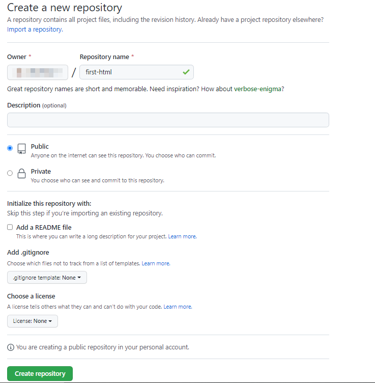 repository name 입력하고, 맨 아래 Create repository 버튼 누름.