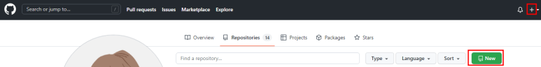 new 버튼 또는 오른쪽 위 + 버튼 클릭해서 new repository 생성