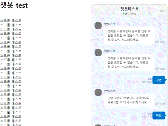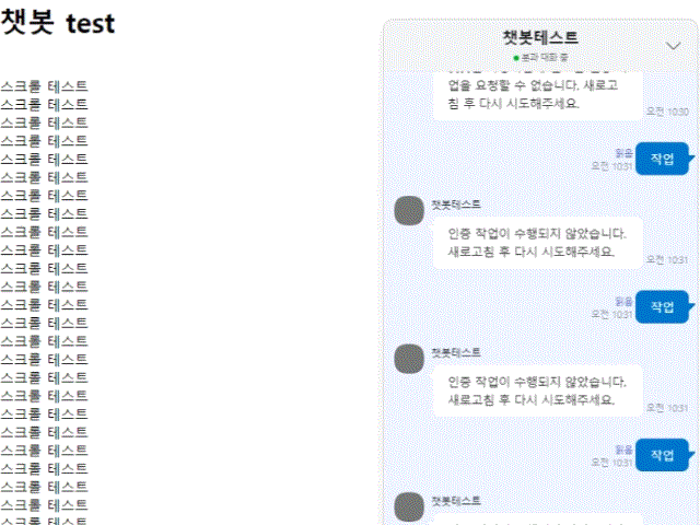마우스를 밖으로 빼면 페이지의 스크롤이 가능하고, 챗봇은 스크롤이 되지 않는 걸 확인할 수 있었다.