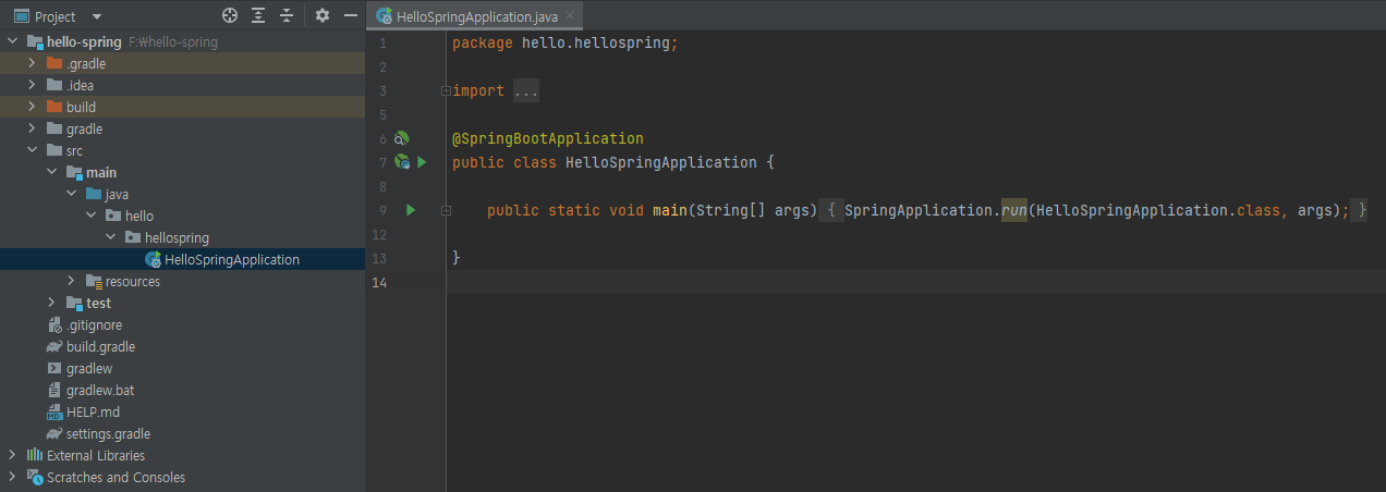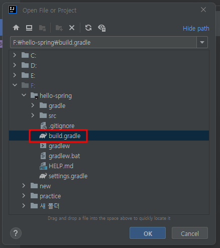 [hello-spring] 폴더에서 build.gradle 선택하고 OK 클릭