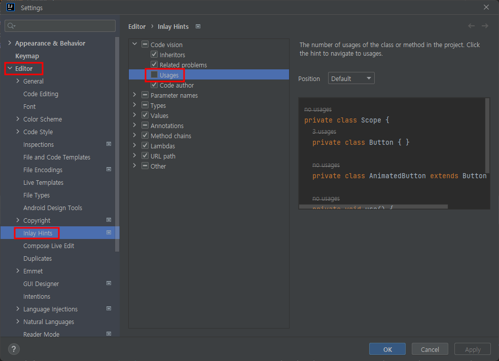 Editor > Inlay Hints > Code vision > Usages 체크 해제