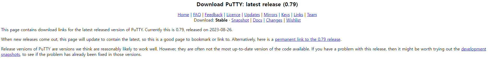 This page contains download links for the latest released version of PuTTY. Currently this is 0.79, released on 2023-08-26. When new releases come out, this page will update to contain the latest, so this is a good page to bookmark or link to. Alternativel
