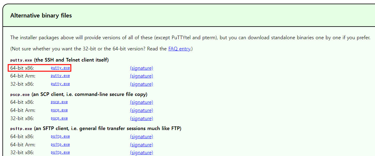 스크롤을 내리면 `Alternative binary files`가 있는데, 저는 거기서 `putty.exe`를 다운로드했습니다.