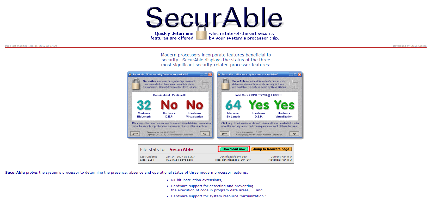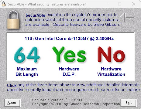 Modern processors incorporate features beneficial to security. SecurAble displays the status of the three most significant security-related processor features: SecurAble probes the system's processor to determine the presence, absence and operational st