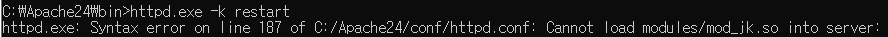 httpd.exe: Syntax error on line 187 of C:/Apache24/conf/httpd.conf: Cannot load moules/mod_jk.so into server: