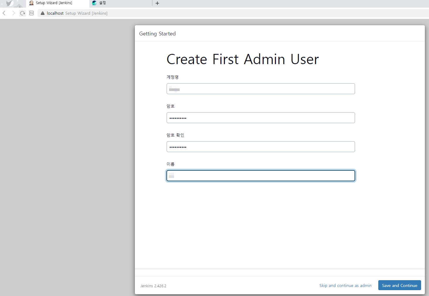 플러그인 설치가 완료되면, Create First Admin User에서 계정을 생성한다.