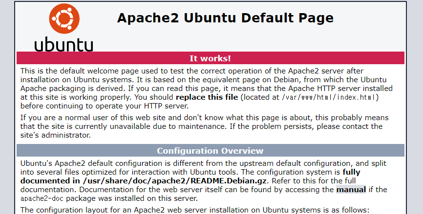 이렇게 아파치 우분투 디폴트 페이지 화면이 나온다.