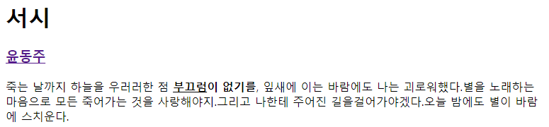 <p>죽는 날까지 하늘을 우러러한 점 <strong><u>부끄럼</u>이 없기를</strong>, 잎새에 이는 바람에도 나는 괴로워했다.별을 노래하는 마음으로 모든 죽어가는 것을 사랑해야지.그리고 나한테 주어진 길을걸어가야겠다.오늘 밤에도 별이 바람에 스치운다.</p>