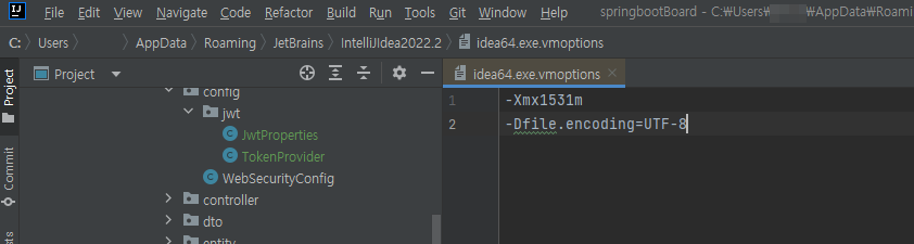 그리고 인텔리제이가 있는 경로에 가서, [idea64.exe.vmoptions] 파일을 찾아서 해당 부분에도