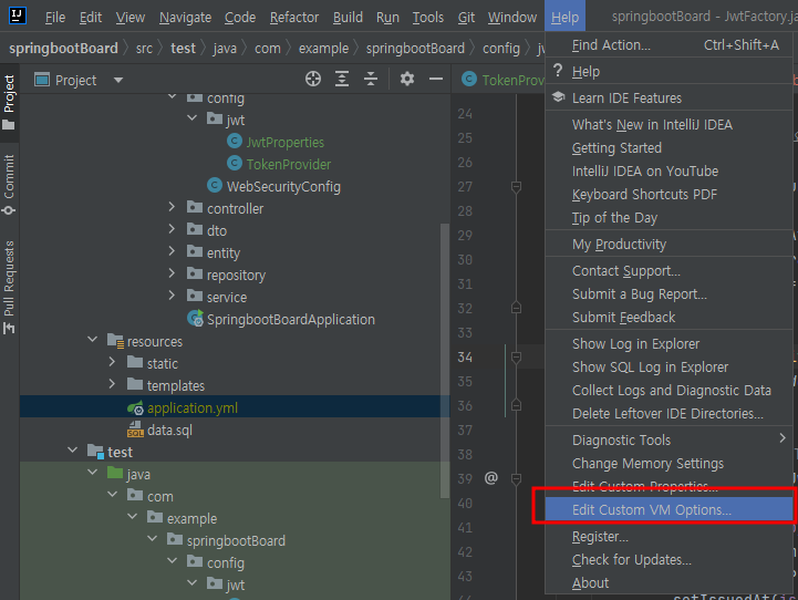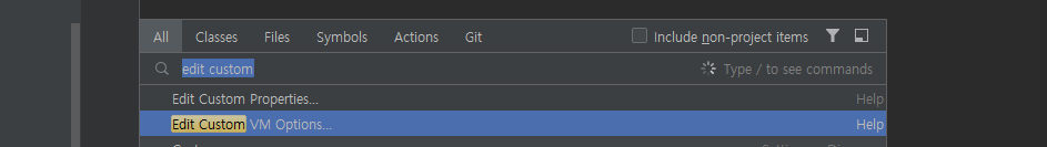 - 인텔리제이에서 shift 2번 클릭 후, [Edit Custom Vm Options...] 검색