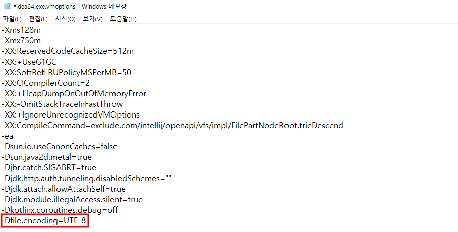 [Eidt Custom VM Options]에서 encoding을 추가해야 한다.