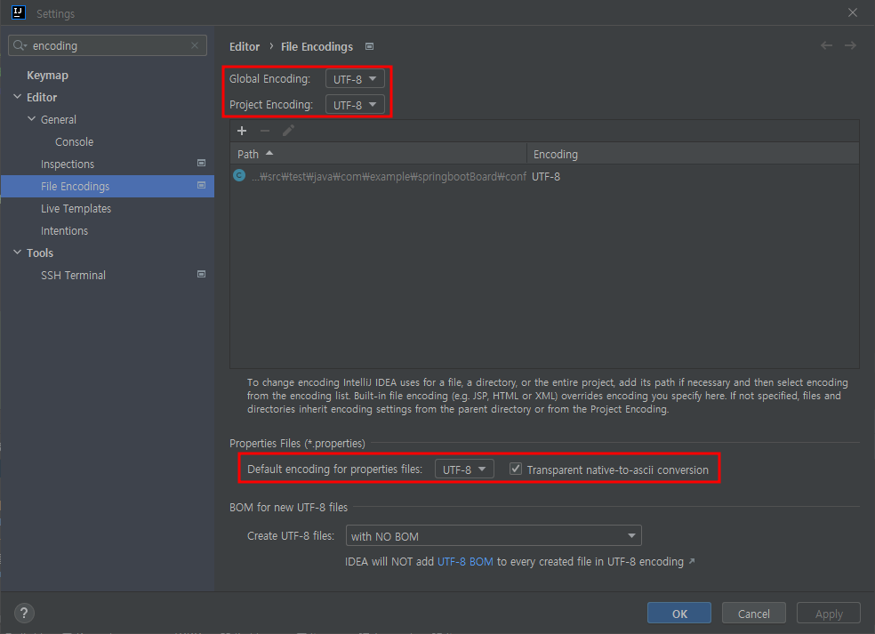 [File] -> [Settings] 로 가서, encoding을 검색한다.
