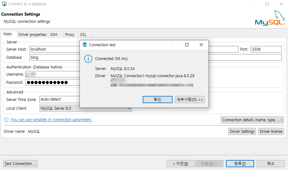 Database는 내가 생성한 디비명을 입력하면 된다.