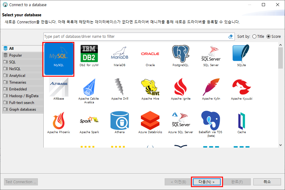 나는 MySQL을 연결한 것이니, MySQL을 선택하고 '다음' 버튼을 클릭했다.