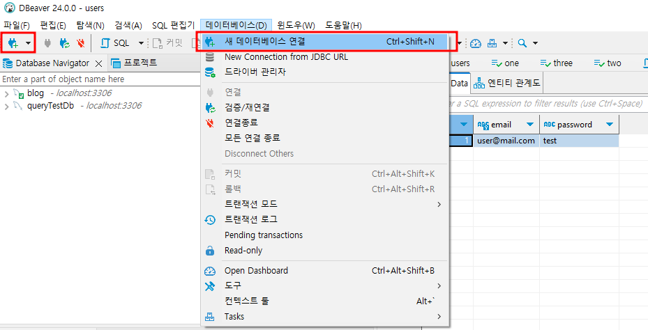 - 데이터베이스 메뉴 -> 새 데이터베이스 연결