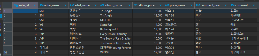 enterId, enterName, artistName, albumName, albumPrice, placeName 까지 동일한 내용이면 한 번만 출력이 되고!