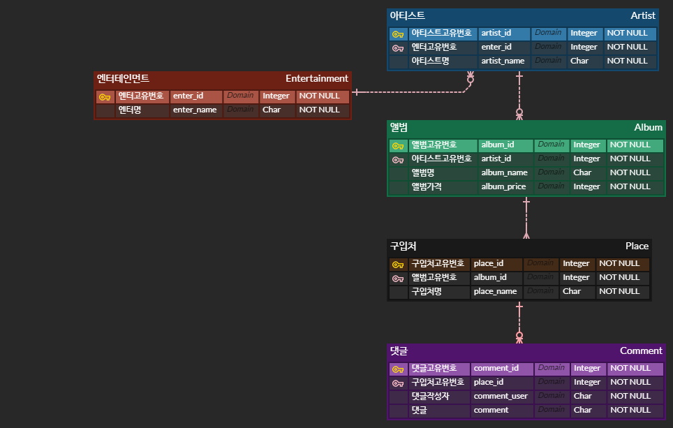 - 한 구입처의 앨범에는 여러 개의 댓글이 달릴 수 있다.