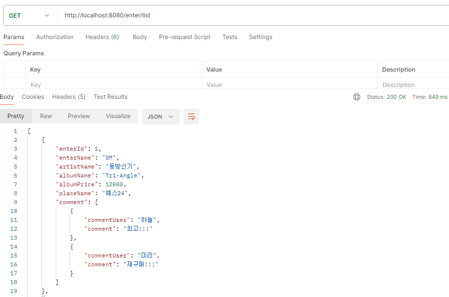 해당 앨범의 댓글은 list에 담겨서 출력이 된다.