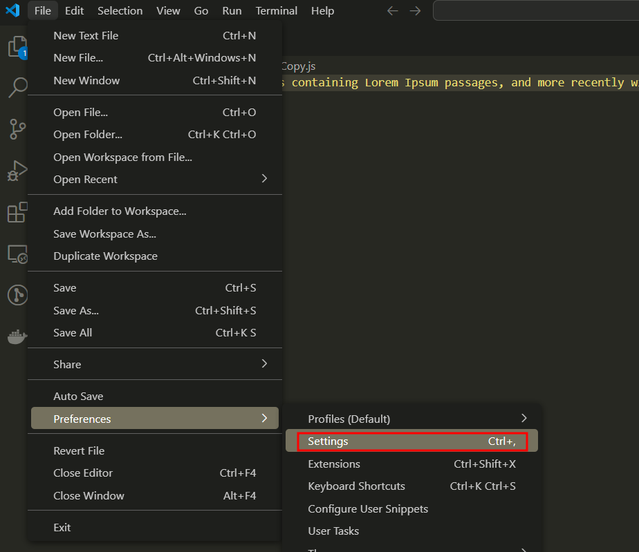 Windows+VSCode 기준으로 위 경로로 `Settings`에 들어가면 된다.