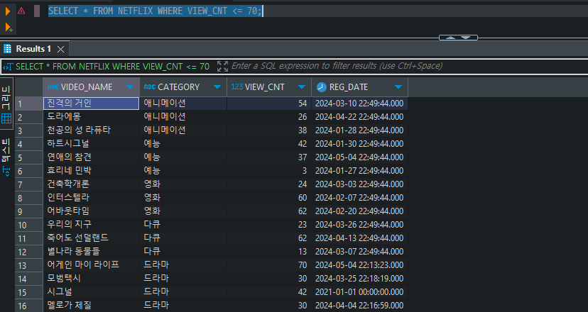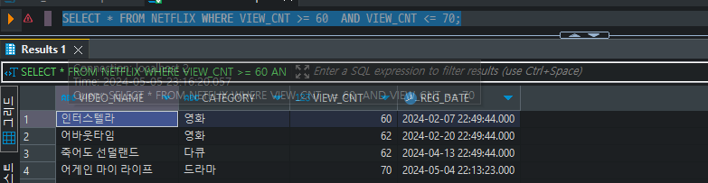 SELECT * FROM NETFLIX WHERE VIEW_CNT >= 60 AND VIEW_CNT <= 70;