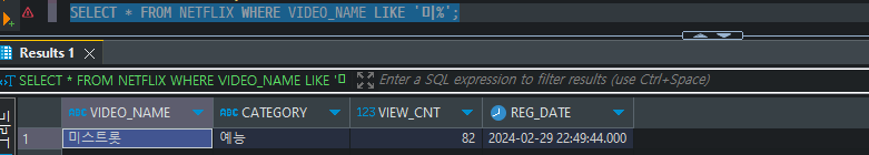 SELECT * FROM NETFLIX WHERE VIDEO_NAME LIKE '미%';