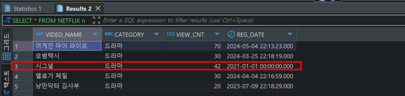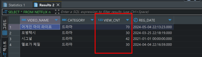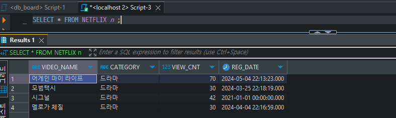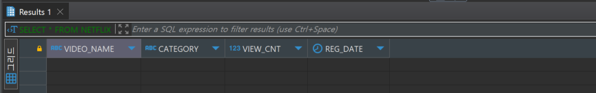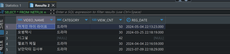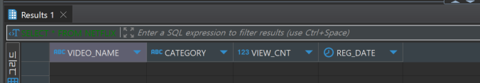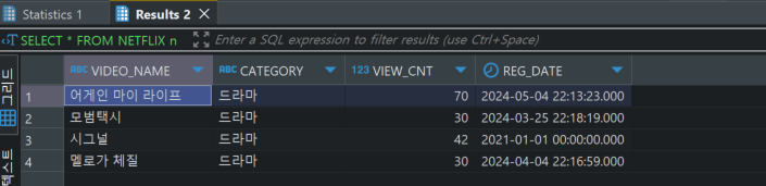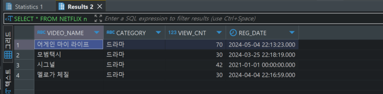SELECT VIDEO_NAME, CATEGORY, VIEW_CNT, REG_DATE FROM NETFLIX n ;