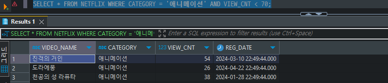 SELECT * FROM NETFLIX WHERE CATEGORY = '애니메이션' AND VIEW_CNT < 70;