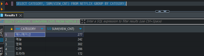SELECT CATEGORY, SUM(VIEW_CNT) FROM NETFLIX GROUP BY CATEGORY;