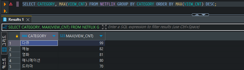 SELECT CATEGORY, MAX(VIEW_CNT) FROM NETFLIX GROUP BY CATEGORY ORDER BY MAX(VIEW_CNT) DESC;