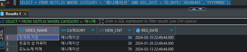 SELECT * FROM NETFLIX WHERE CATEGORY = '애니메이션' AND REG_DATE < TO_DATE('20240401','YYYYMMDD');