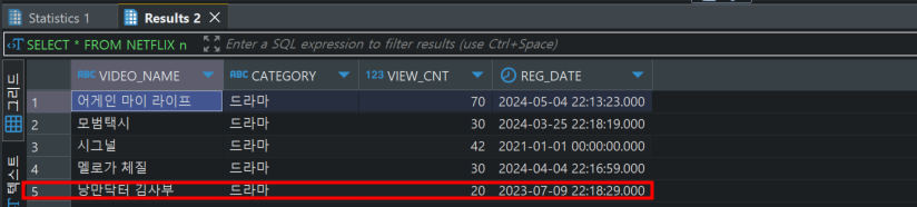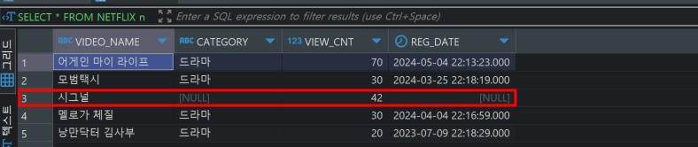 INSERT INTO NETFLIX n VALUES ('멜로가 체질', '드라마',30, SYSDATE-30);