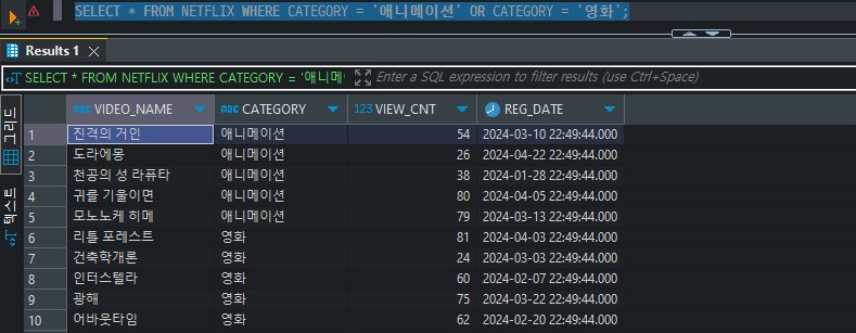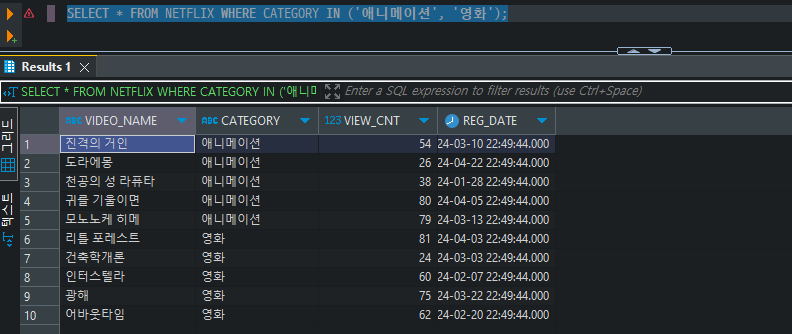 SELECT * FROM NETFLIX WHERE CATEGORY = '애니메이션' OR CATEGORY = '영화';