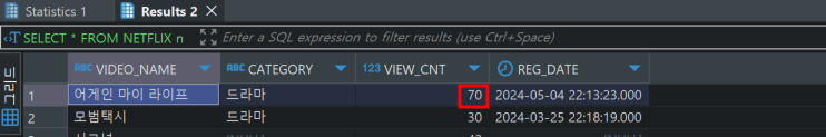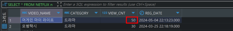 UPDATE NETFLIX SET VIEW_CNT = 70 WHERE VIDEO_NAME = '어게인 마이 라이프';