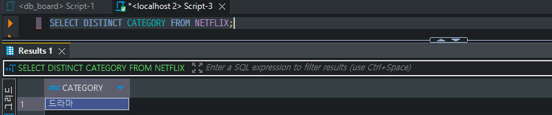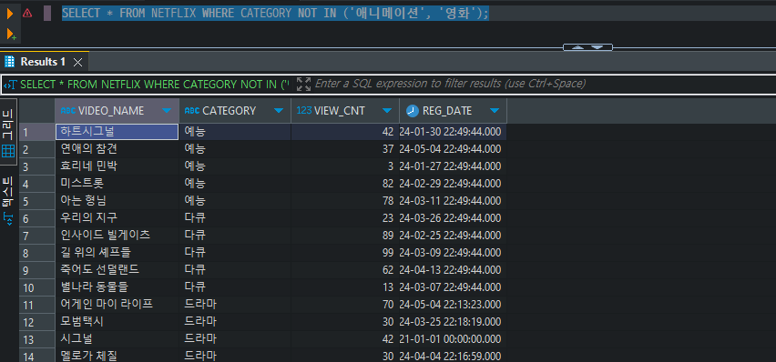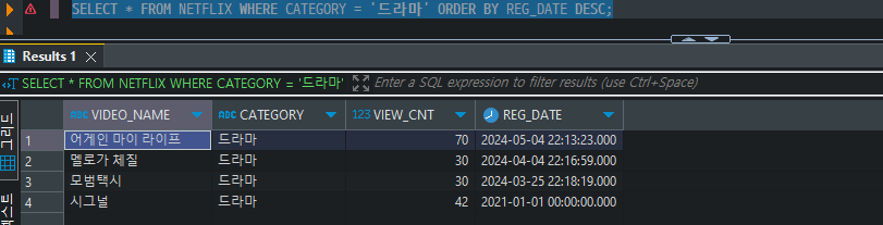 SELECT * FROM NETFLIX WHERE CATEGORY = '드라마' ORDER BY REG_DATE DESC;