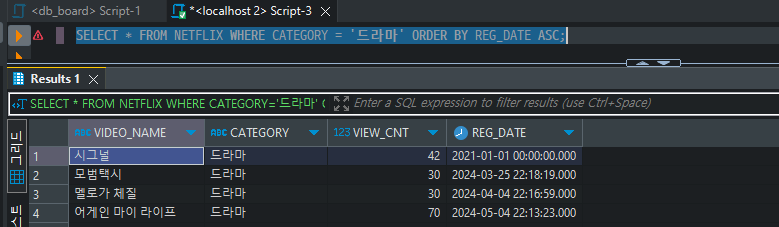 SELECT * FROM NETFLIX WHERE CATEGORY = '드라마' ORDER BY REG_DATE ASC;