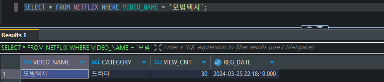 SELECT * FROM NETFLIX WHERE VIDEO_NAME = '모범택시';