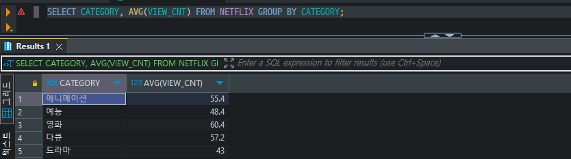 SELECT CATEGORY, AVG(VIEW_CNT) FROM NETFLIX GROUP BY CATEGORY;