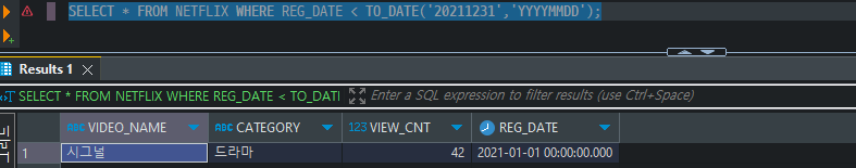 SELECT * FROM NETFLIX WHERE REG_DATE < TO_DATE('20211231','YYYYMMDD');