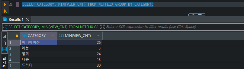 SELECT CATEGORY, MIN(VIEW_CNT) FROM NETFLIX GROUP BY CATEGORY;