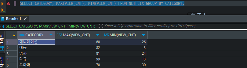 SELECT CATEGORY, MAX(VIEW_CNT), MIN(VIEW_CNT) FROM NETFLIX GROUP BY CATEGORY;