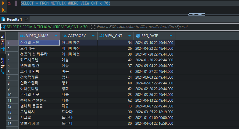 SELECT * FROM NETFLIX WHERE CATEGORY = '애니메이션' AND VIEW_CNT < 70;