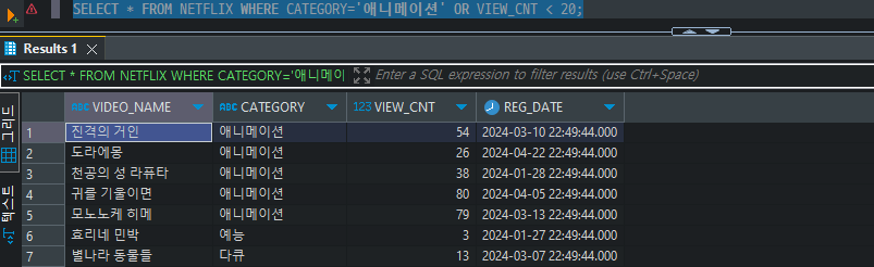 SELECT * FROM NETFLIX WHERE CATEGORY='애니메이션' OR VIEW_CNT < 20;