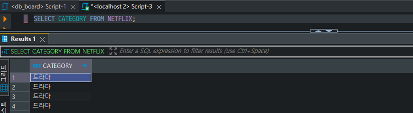SELECT * FROM NETFLIX WHERE CATEGORY = '드라마' ORDER BY REG_DATE DESC;
