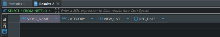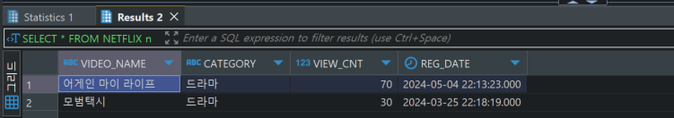 SELECT VIDEO_NAME, CATEGORY, VIEW_CNT, REG_DATE FROM NETFLIX n ;