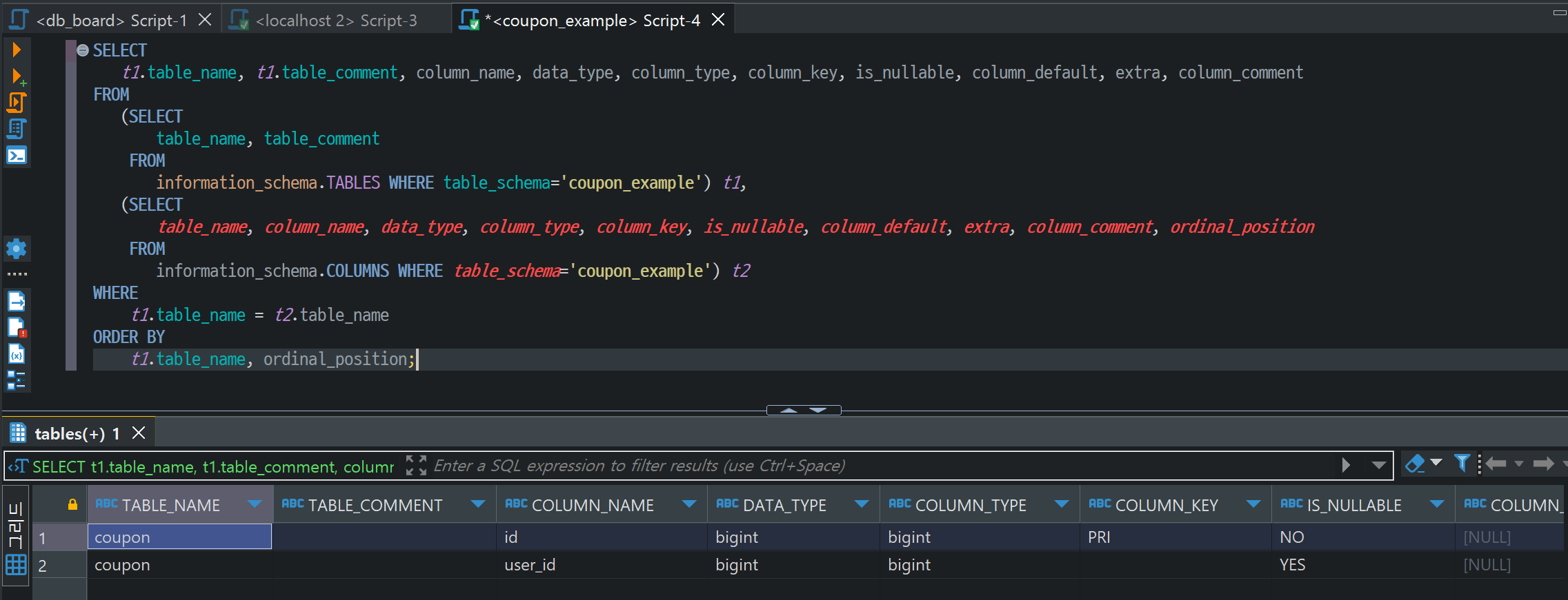 information_schema.COLUMNS WHERE table_schema='databse명') t2