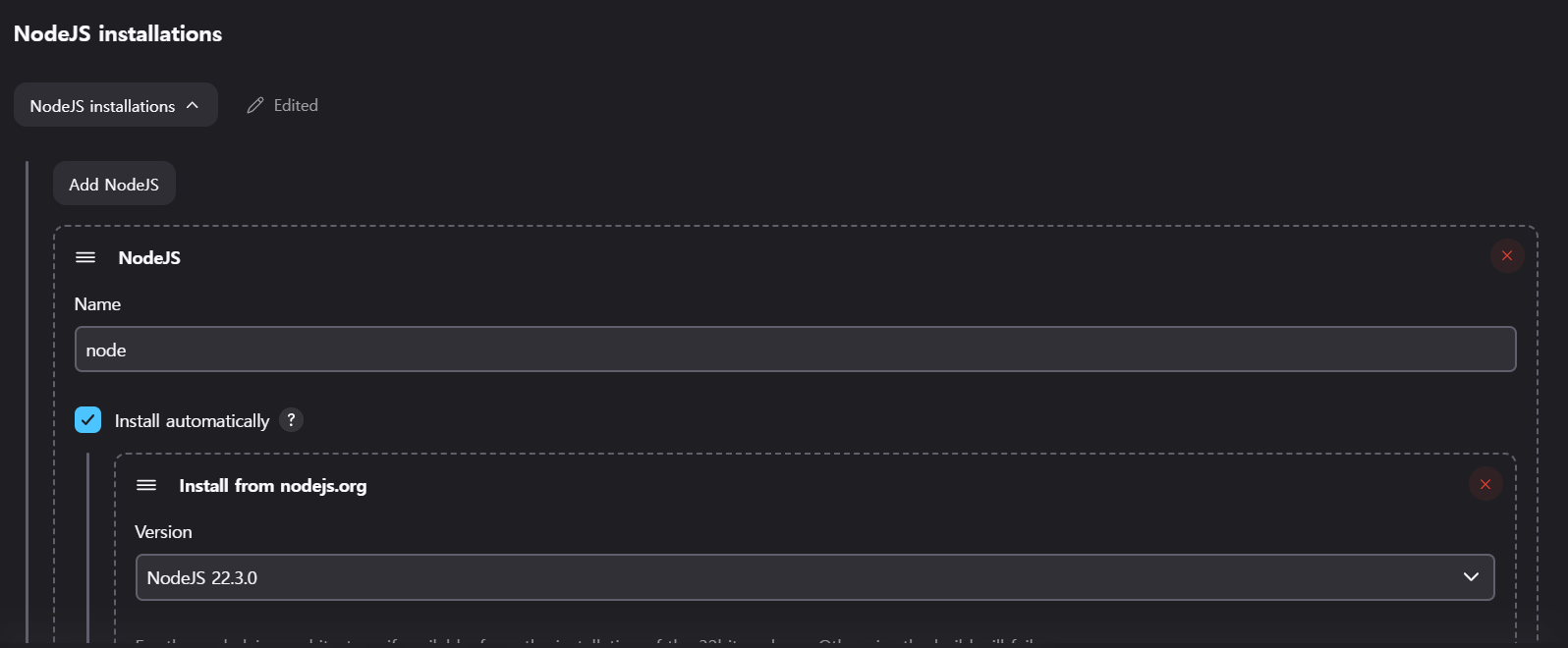 👉 Jenkins 관리 > Tools > NodeJs installations