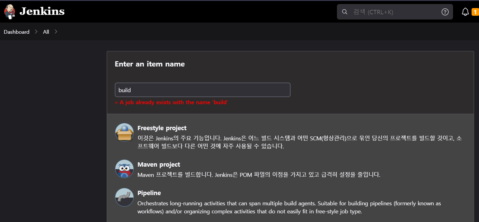 - name 입력 후, Pipleline 선택하고, OK 버튼 클릭함
