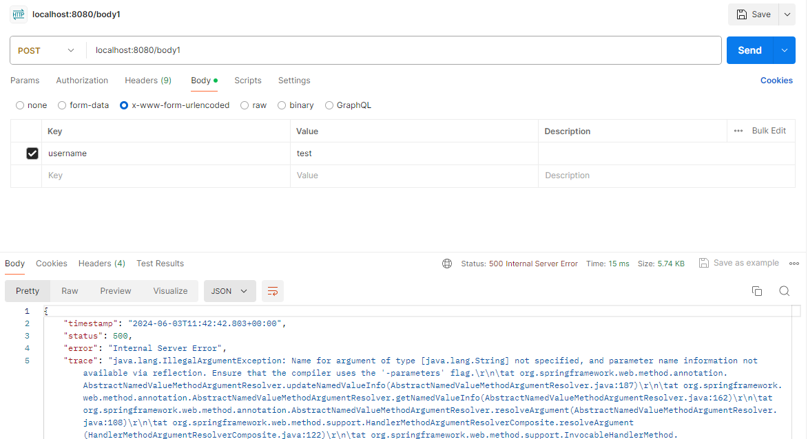 2024-06-03T20:44:01.912+09:00 ERROR 12604 --- [test] [nio-8080-exec-4] o.a.c.c.C.[.[.[/].[dispatcherServlet] : Servlet.service() for servlet [dispatcherServlet] in context with path [] threw exception [Request processing failed: java.lang.IllegalArgumentException: Name for argument of type [java.lang.String] not specified, and parameter name information not available via reflection. Ensure that the compiler uses the '-parameters' flag.] with root cause