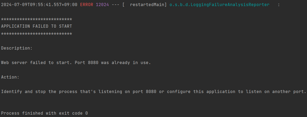 2024-07-09T09:55:41.557+09:00 ERROR 12024 --- [ restartedMain] o.s.b.d.LoggingFailureAnalysisReporter :